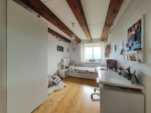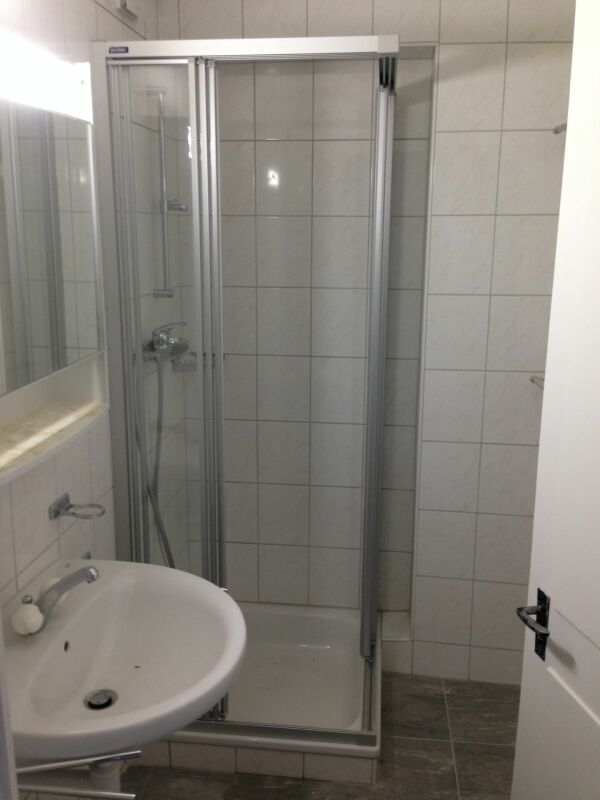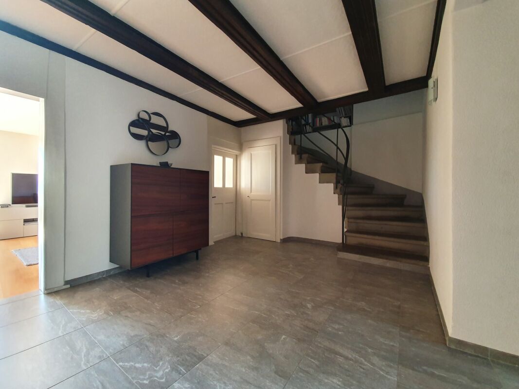 Rez: petit hall et hall d’entrée, cuisine habitable entièrement agencée avec lave et sèche-linge, séjour/coin à manger avec balcon, salle de douche/lavabo, wc séparé, réduit sous l’escalier.