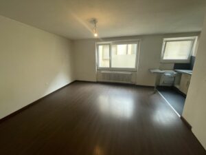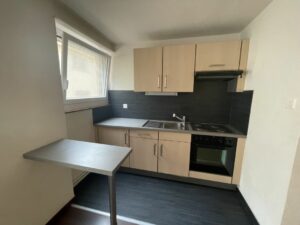 Ce studio se compose ainsi : vaste hall avec armoires, cuisine agencée ouverte sur une grande pièce à vivre, salle de bains/wc.